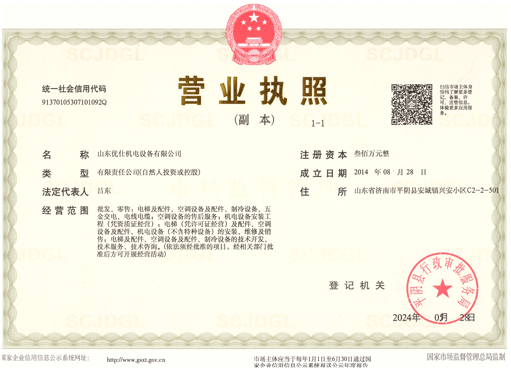 山东优仕机电设备有限公司是一家专业从事电梯销售、安装、维保、维修为一体的电梯专业公司,我公司成立于2014年,持有国家质量监督检验检总局颁发的《特种设备生产许可证》A 级资质,是通力电梯、日立电梯、广州广日电梯、怡达快速电梯、西奥电梯、沃克斯迅达电梯销售代理商,通过不断创新和积累,在电梯销售、安装、维修保养规范、品质、配件供应、服务理念、安全管理等方面具有优势。
